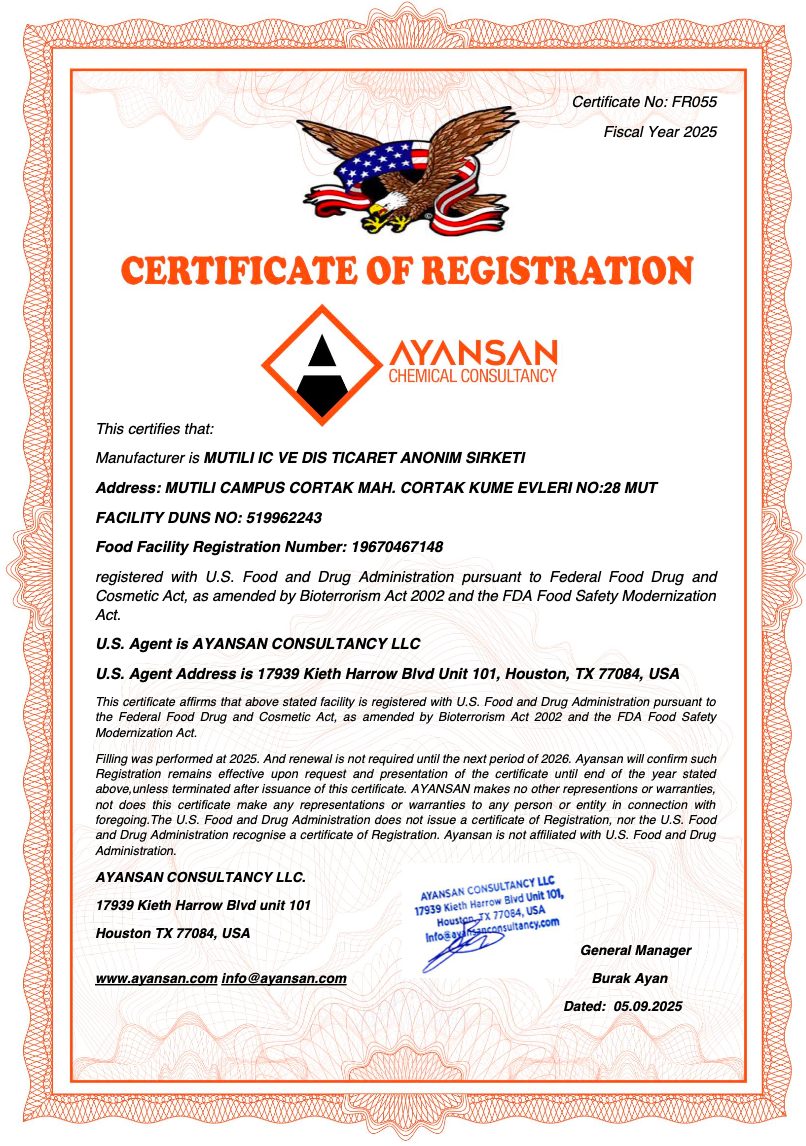 Bu belge, ürünlerimizin Amerika Birleşik Devletleri gıda standartlarına uygun olduğunu ve ABD pazarına giriş için onaylandığını gösterir.