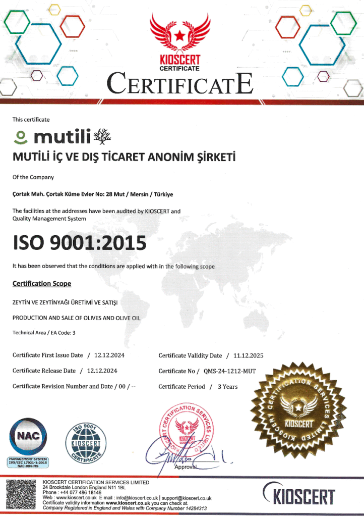 Uluslararası Kalite Yönetim Sistemi standardıdır. Zeytin ve zeytinyağı üretim ve satış süreçlerimizin kalitesini ve müşteri memnuniyetini güvence altına aldığımızı belgeler.
