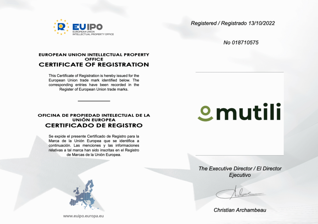 Bu sertifika, 'mutili' markamızın Avrupa Birliği Fikri Mülkiyet Ofisi (EUIPO) nezdinde resmi olarak tescil edildiğini ve koruma altında olduğunu gösterir.